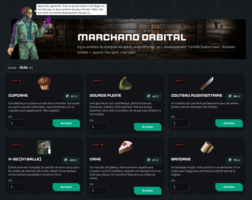 Les articles disponibles sont strictement issus des stocks internes de la Station.